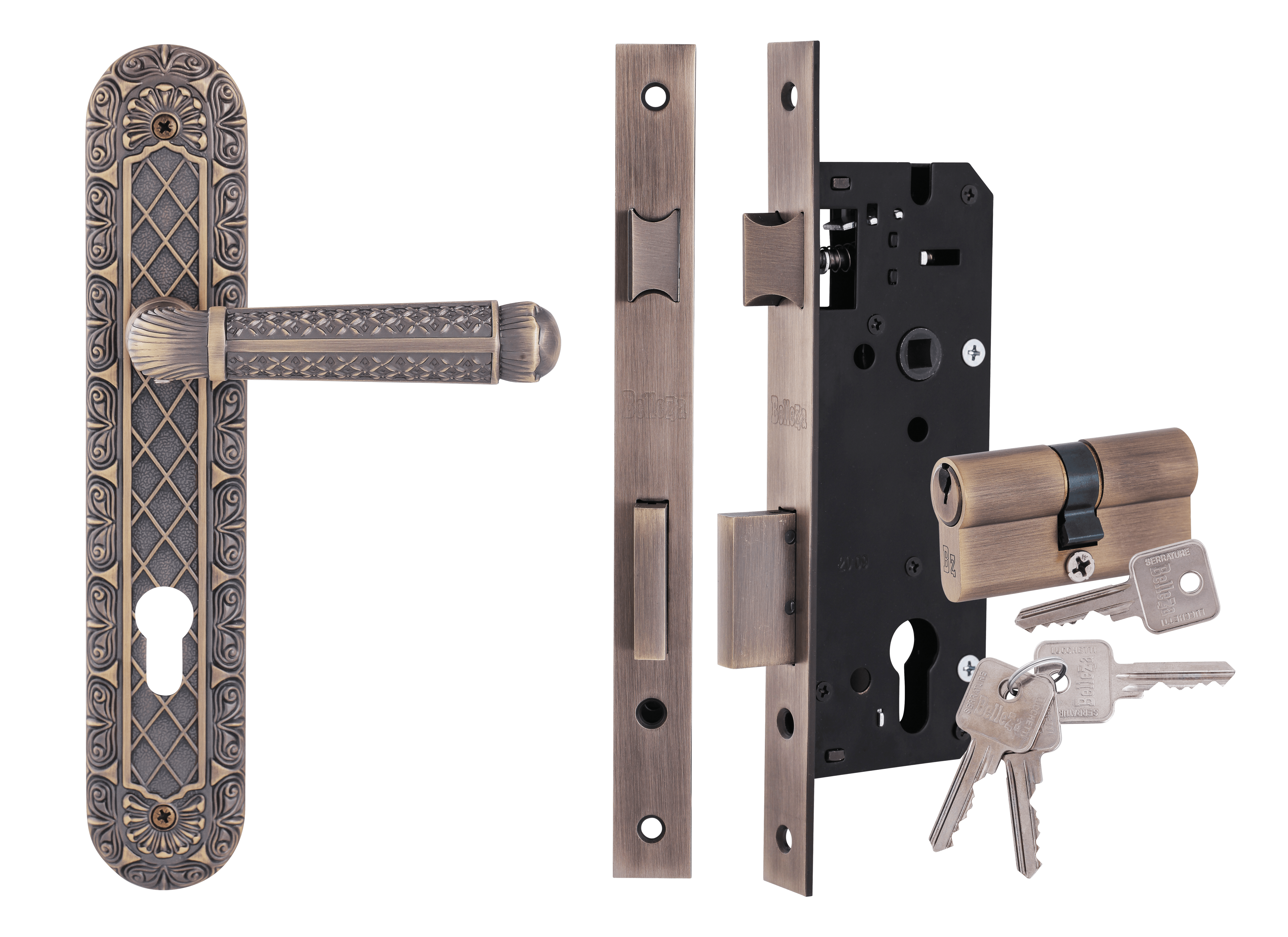 Produk tipe Belezza Premium juga memiliki karakteristik sambungan (welding) dan bentuk (forming) yang lebih bagus dari varian tipe yang lain. Handle set sangat praktis karena sudah dijual dalam satu set. Handle berbahan Zinc Alloy dengan finsihing MAB. Lockcase dengan finishing MAB. Double Cylinder dengan finishing MAB, anak kunci dapat dibuatkan master key.