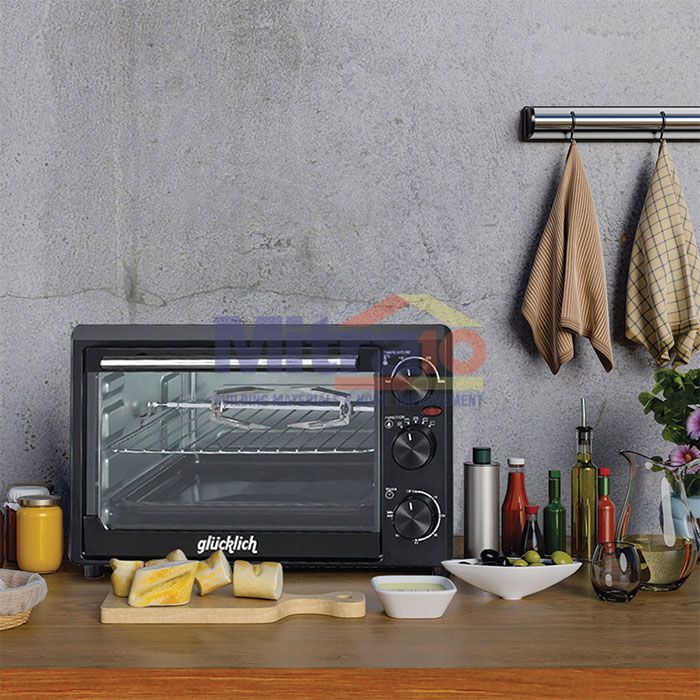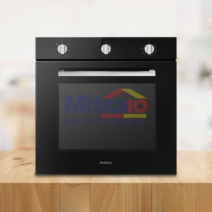 Spesifikasi: K17 metal knob, Mechanical control switch, Removable side racks and glass door, One top light, Aluminum handle, Triple glazed glass door and turn spit, Fan inside, Blue color cavity, Full black glass.