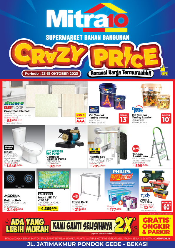 Promo Crazy Price menawarkan hadiah menarik khusus untuk Sahabat Mitra10 Supermarket Bahan Bangunan. Belanja di Mitra10 Supermarket Bahan Bangunan dan dapatkan berbagai macam hadiah dari Promo Mitra10. Promo Crazy Price berlaku selama periode 23-31 Oktober 2023. Tunggu apalagi, Belanja Sekarang juga dan gunakan Promo Crazy Price untuk traksansi anda. Datang ke Mitra10 Supermarket Bahan Bangunan terdekat atau melalui online website mitra10.com dan download aplikasi mitra10 di playstore kalian.