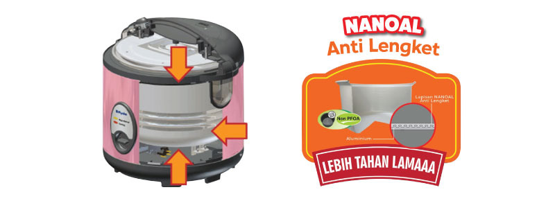Selain itu MCM-508 SBC dilengkapi juga dengan inner pot yang dilapisi dengan NANOAL. Nanoal adalah lapiasan anti lengket, tidak mudah tergores, lebih tahan lam dan tidak membuat nasi cepat mengering.