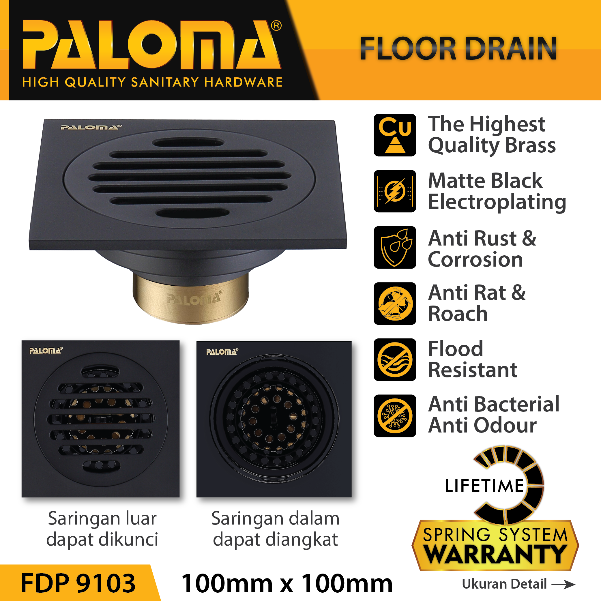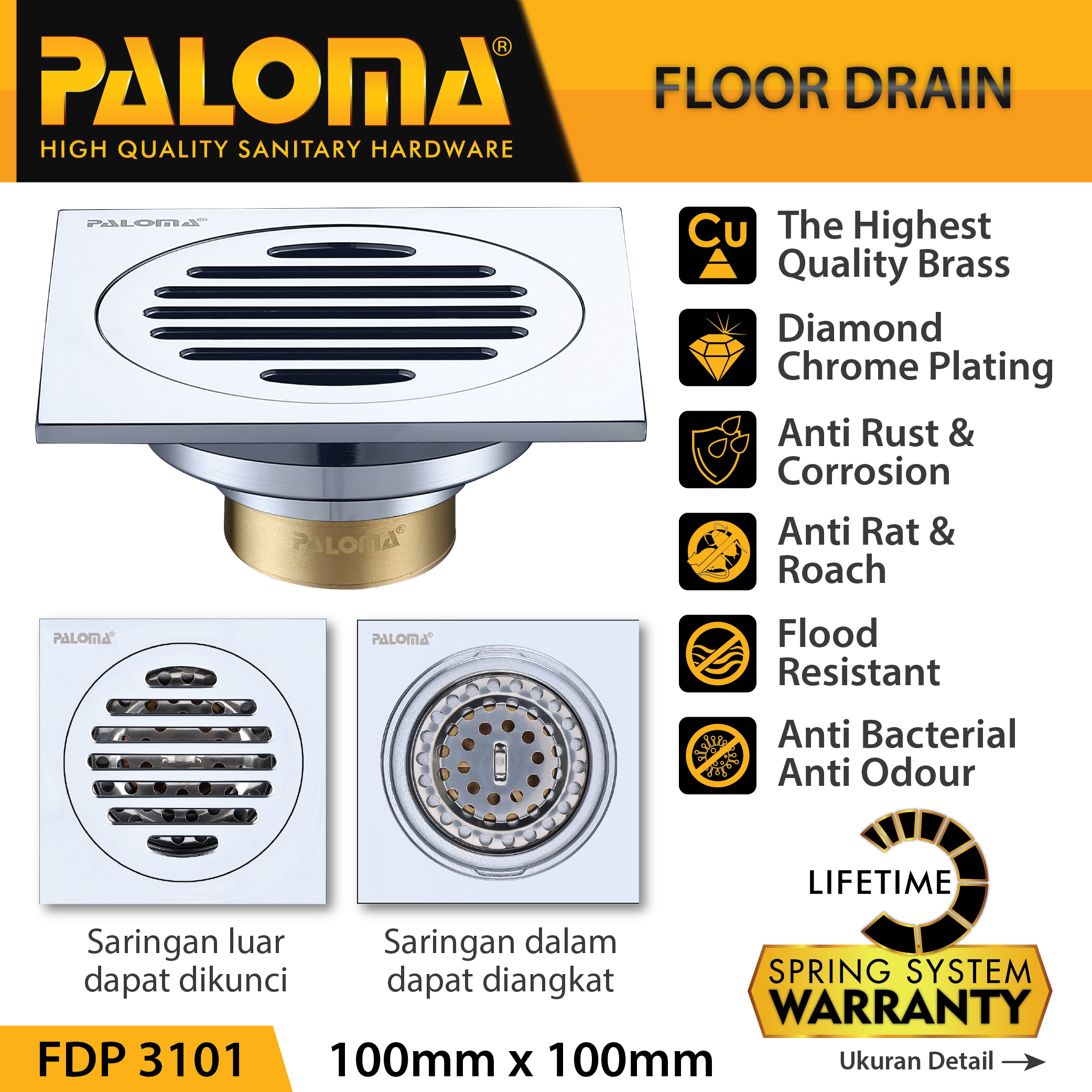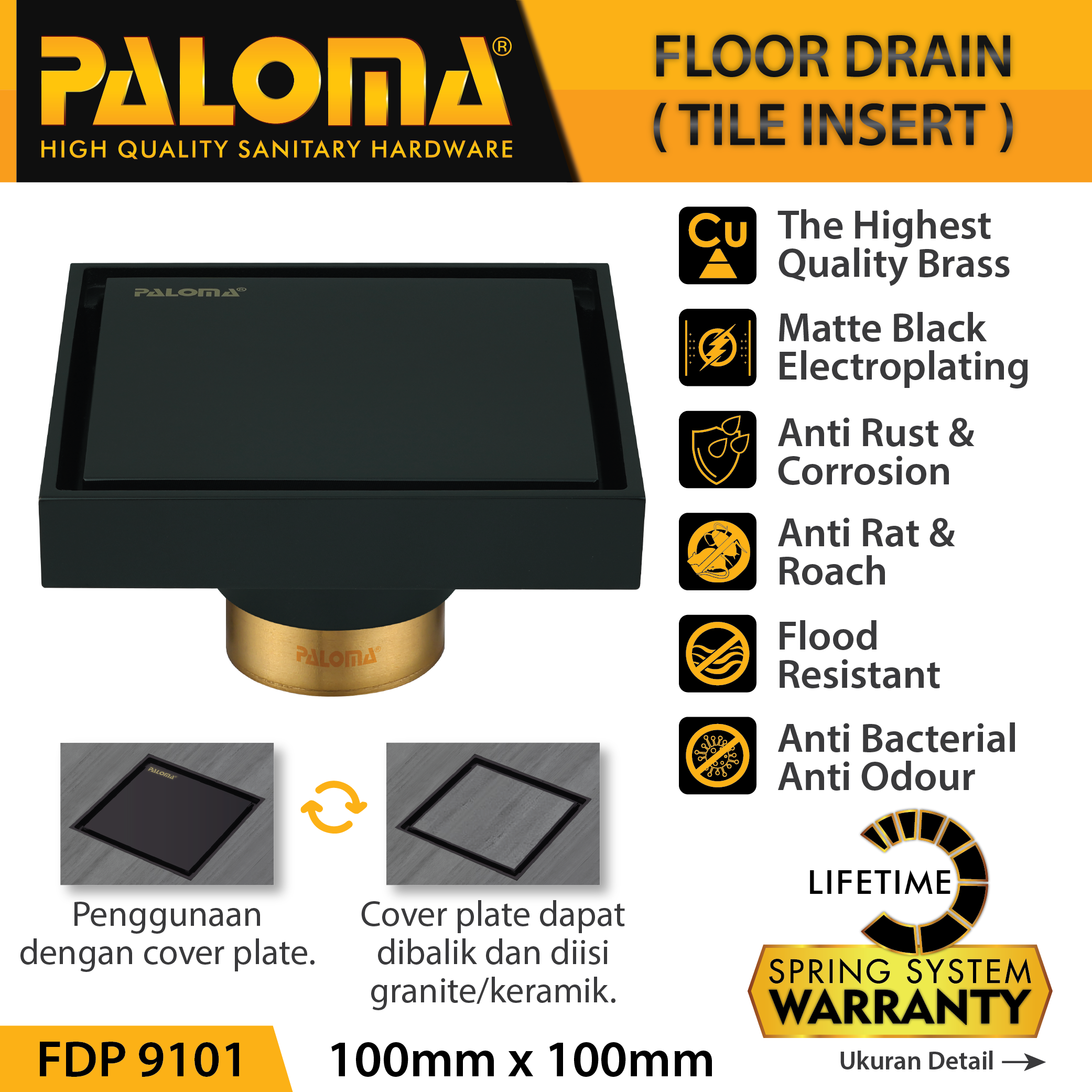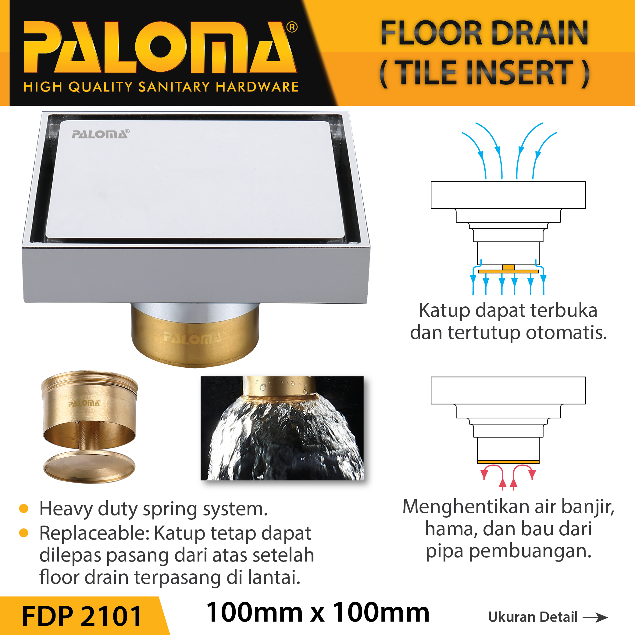 Smart Floor Drain PALOMA memiliki 2 tipe tampilan, tile-insert dan standard. Smart Floor Drain tile-insert (FDP 2101, FDP 2102, FDP 9101, FDP 9102) memiliki cover plate yang dapat dibalik dan diisi dengan keramik kamar mandi anda untuk tampilan yang lebih modern dan seamless. Tipe tile-insert ini memiliki 2 warna, Chrome dan Matte Black, dan memiliki 2 ukuran, 10x10cm dan 12x12cm. Smart Floor Drain dengan tampilan standard (FDP 3101, FDP 9103) adalah pilihan tepat jika anda ingin pilihan yang lebih ekonomis dan tidak memprioritaskan estetika.