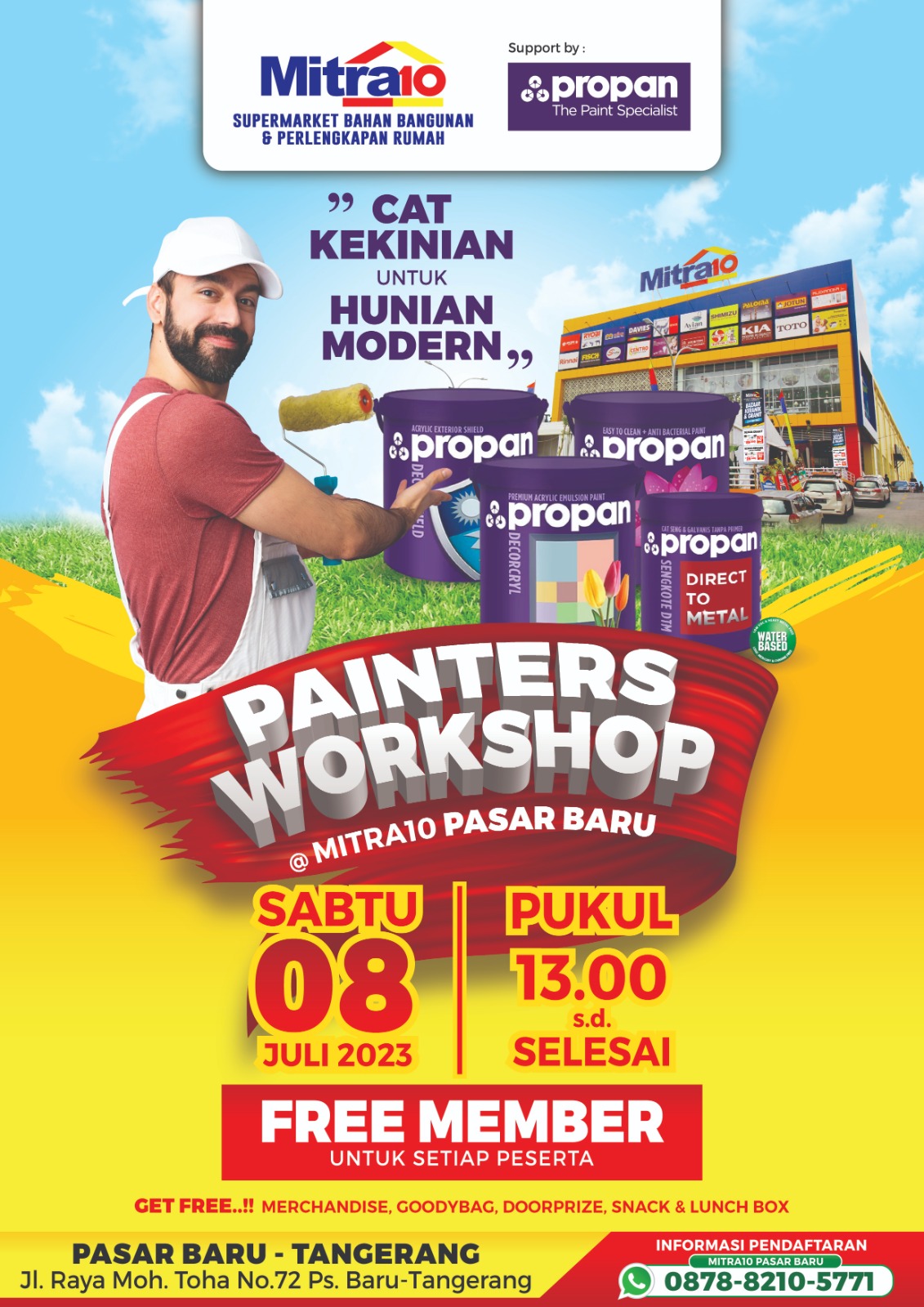 Mitra10 yang bekerjasama dengan PT. Propan Raya ICC (Propan) sebagai Brand Cat ternama di Indonesia, dimana dalam acara ini menghadirkan pelatihan untuk para Applicator/Tukang/Mandor/Kontraktor dll pada Program "Painters Workshop" yang akan diselenggarakan selama periode Juli 2023 di :
