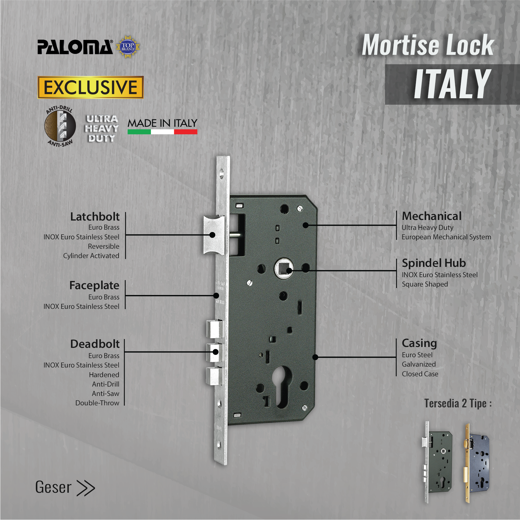 Mortise lock Italy Paloma memiliki kualitas tinggi dan diproduksi langsung dari Italy (Made in Italy). Mortise ini sudah lulus pengujian hingga 250,000 kali dengan standar Eropa dan cocok untuk jenis pintu kayu atau logam dengan berat maksimal 200 kg. Memiliki garansi seumur hidup pada bagian mekanik dan telah bersertifikat ICIM Italy dan Eropa CE.
