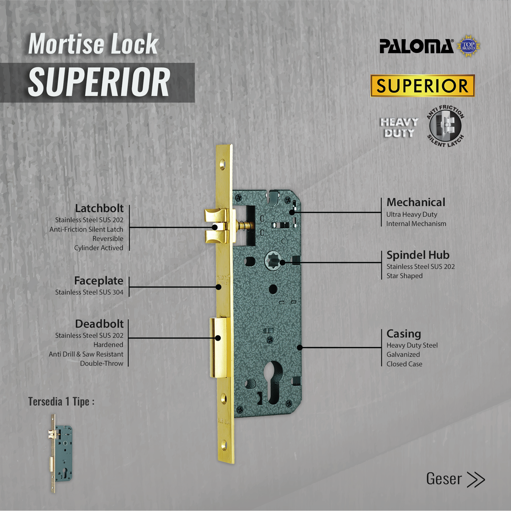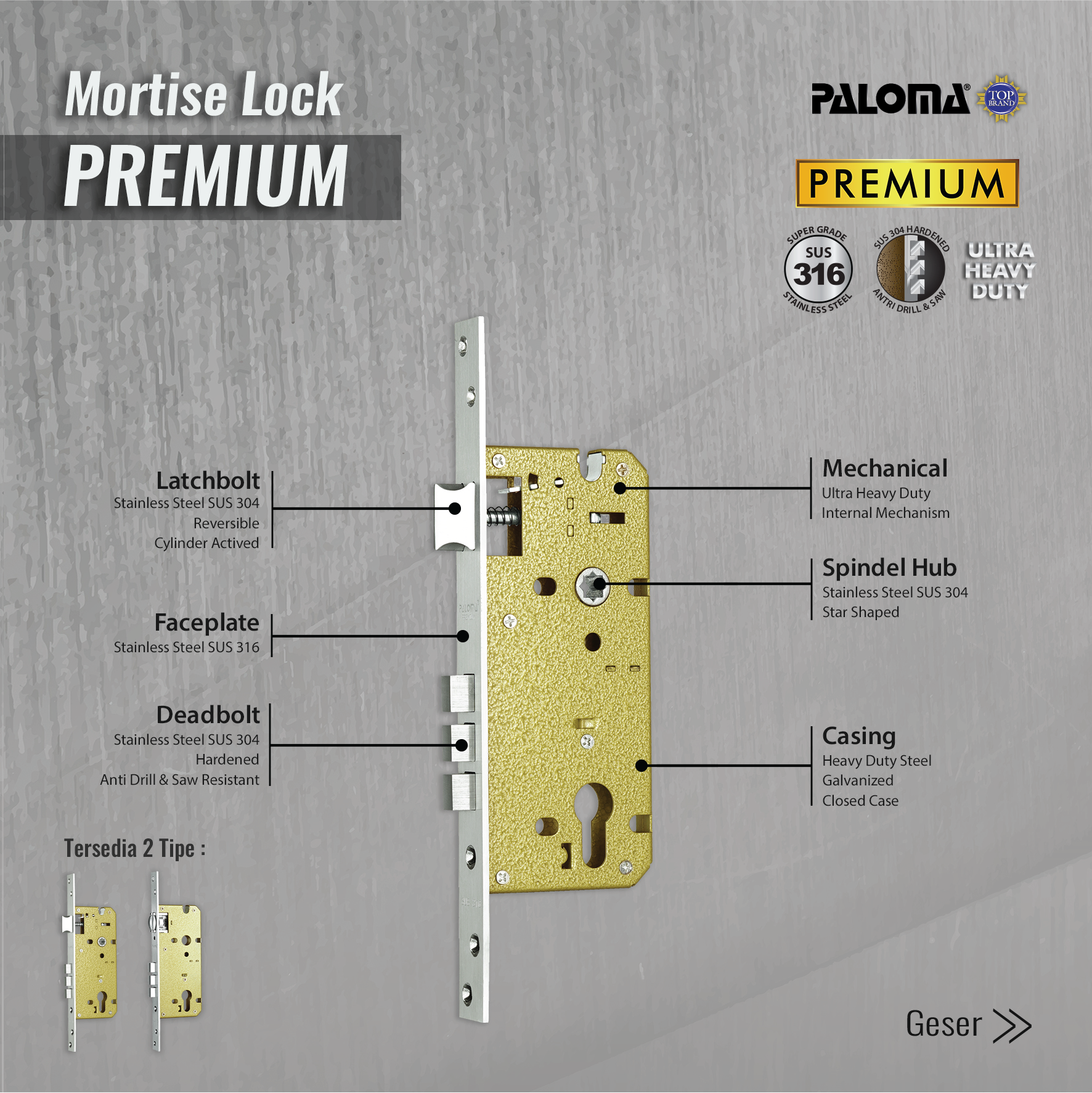 Mortise lock deluxe PALOMA, dengan keamanan ekstra, anti drill dan resistance pada bagian deadbolt nya. Telah lulus uji coba 200,000 kali untuk penggunaan dengan frekuensi tinggi seperti pintu umum di gedung perkantoran. Mortise lock ini dapat digunakan untuk pintu kayu atau logam dengan bobot pintu hingga 150kg. Memiliki garansi mekanik selama 25 tahun.