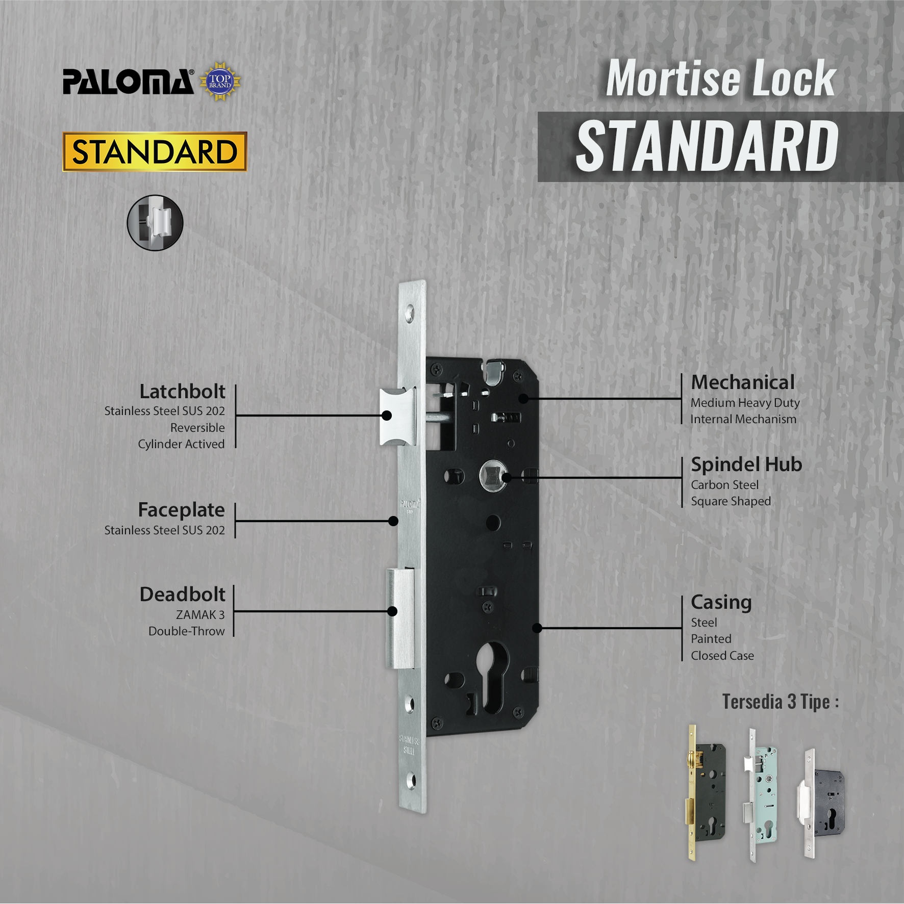 Mortise lock standard PALOMA terbuat dari material stainless steel SUS 202 yang penggunaannya dengan frekuensi sedang seperti untuk hunian dan dapat digunakan untuk pintu jenis kayu dengan berat maksimal 100kg. Mortise lock ini memiliki garansi mekanik selama 5 tahun.
