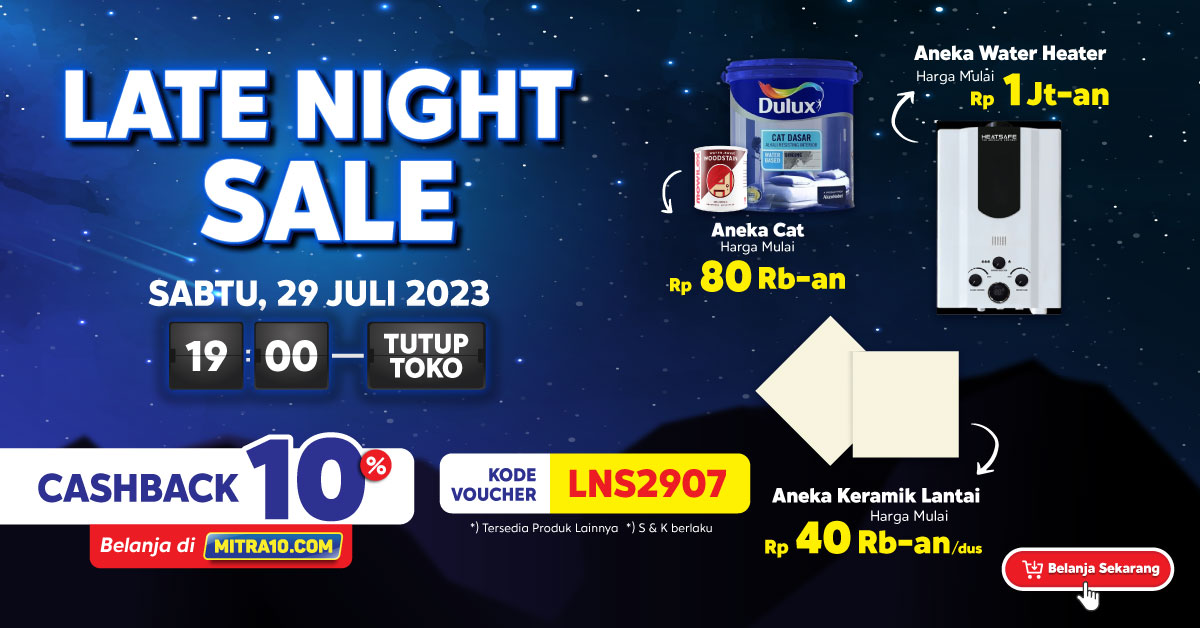 Hallo Sahabat Mitra10. Mitra10 Supermarket Bahan Bangunan Terbesar dan Terlengkap menyediakan banyak barang sesuai dengan kebutuhan anda. Tersedia banyak Promo Online maupun Offline. Mitra10 menawarkan hadiah menarik salah satu nya Promo Late Nite Sale. Promo Late Nite Saleberlaku hanya 1 Hari di tanggal 14 Oktober 2023. Nikmati keuntungan setiap belanja di Mitra10 offline maupun online. Tunggu apalagi, Belanja Sekarang juga di Mitra10 terdekat atau melalui online website mitra10.com dan download aplikasi mitra10 di playstore kalian.