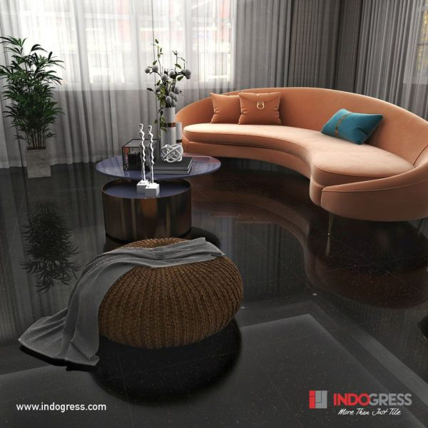 Pemilihan granit warna hitam untuk lantai dapat membuat ruangan terlihat elegan dan tegas. Lantai granit warna hitam sangat cocok diaplikasikan pada ruang tamu dengan konsep monokrom. Black Gold dengan sentuhan permukaan yang kilap mampu menyulap ruang tamu Anda menjadi terlihat mewah dan berkelas.