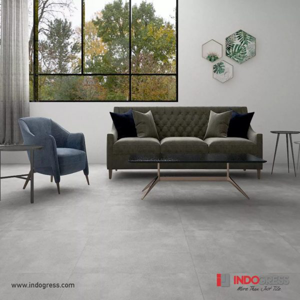 Granit warna abu-abu banyak menjadi pilihan sebagai lantai ruang tamu karena warnanya yang netral dan sederhana. Jadi, sangat mudah untuk dipadukan dengan warna lainnya. Salah satu produk lantai granit milik Indogress adalah Ferro Infinito. Dengan warna abu-abu muda yang dimilikinya akan menjadikan ruangan terlihat lapang dan modern. Selain itu, coraknya yang menyerupai tampilan lapisan semen dapat menonjolkan elemen interior ruang tamu Anda.