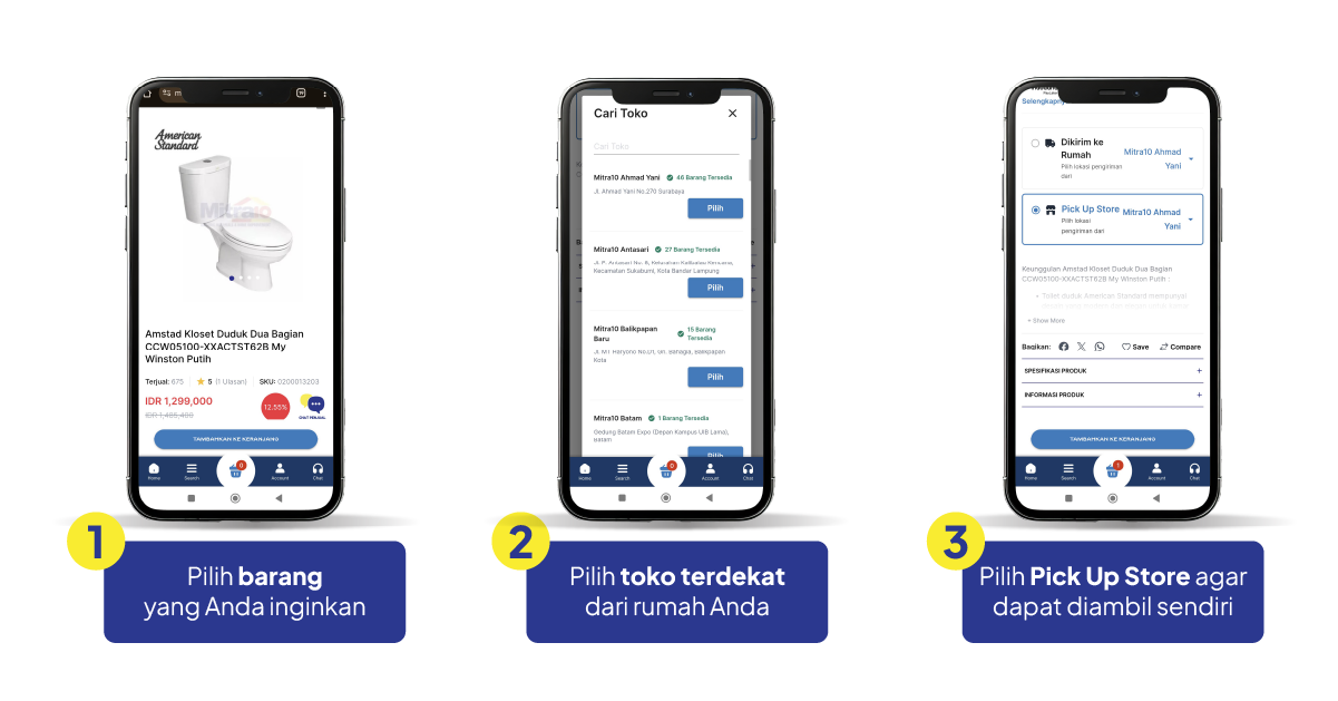 Pick Up Store adalah layanan yang memungkinkan pelanggan Mitra10 untuk berbelanja secara online melalui website Mitra10.com dan memilih untuk mengambil barang yang telah dibeli di toko fisik Mitra10 yang dipilih. Layanan ini cocok bagi Anda yang ingin menghemat biaya pengiriman dan segera mendapatkan barang tanpa menunggu lama.