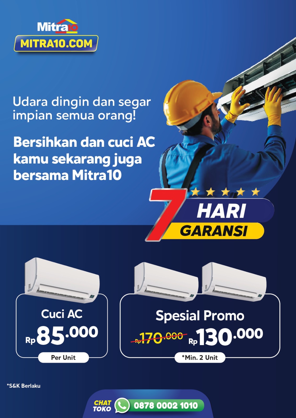Mitra10 juga menyediakan layanan cuci AC untuk memastikan perangkat pendingin ruangan Anda tetap bekerja dengan optimal. Layanan ini mencakup pembersihan bagian dalam dan luar unit AC, pengecekan kebocoran, serta pengisian freon jika diperlukan. Untuk mendapatkan layanan cuci AC klik disini.